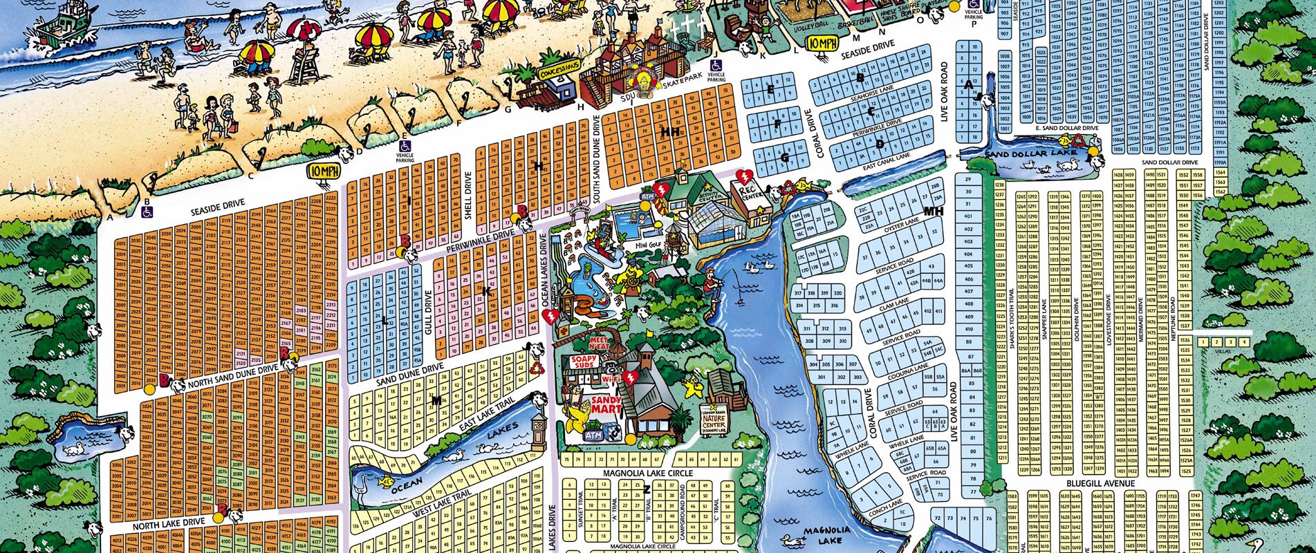 Ocean Lakes campground offers beach access, indoor and outdoor pools, water park, playground, snack bar, basketball courts, miniature golf, arcade, grocery store and 24-hour security.