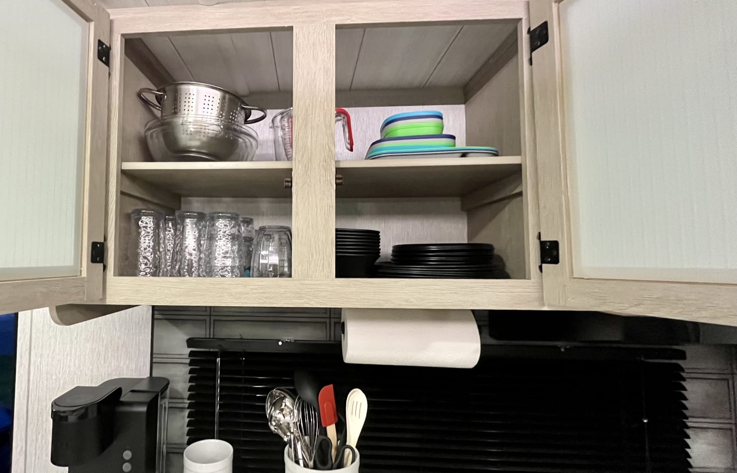 Kitchen: Keurig Coffee Maker, coffee mugs, complimentary coffee pods, plates, saucers, bowls, glasses, mixing bowls, measuring cups, strainer, silverware, serving spoons/spatulas knife set, can opener, pizza cutter, kitchen scissors, pots, pans, oven mitts, hot pads, ice cube trays with storage, and children's dining set